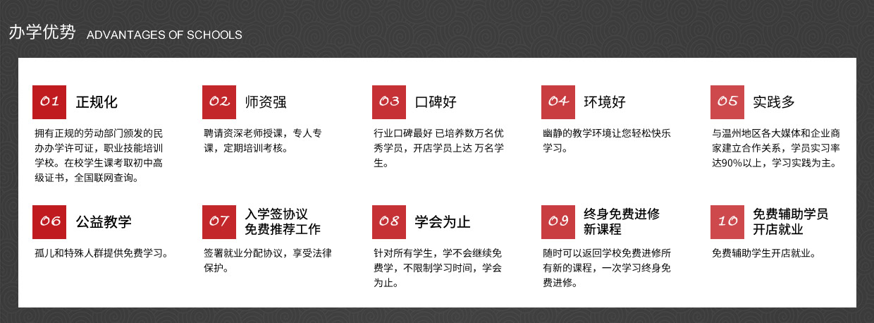 我校以培養(yǎng)實用型專業(yè)人才為目標,理論學習、操作訓練與專業(yè)實踐三位一體,實行一對一的教學模式,常年招生,男女不限。畢業(yè)后推薦工作、 主要是以理論為輔實操為主的教學模式授課。老師手把手教、一對一輔導,為學員量身定做課程,保證學會為止、 中途不收取任何費用,(無任何隱形消費)進修新的課程。、簽約教學、幫助學員開店就業(yè),免費試學(讓您全方位的體驗我們的專業(yè)、讓你不花一分冤枉錢。)